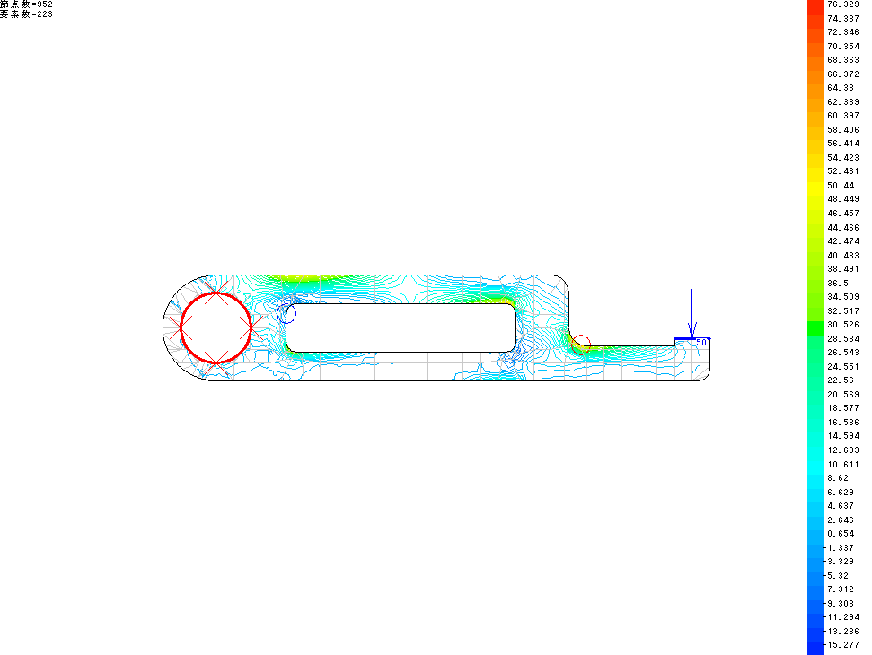 | ミーゼス応力σm(N/mm^2) | 69.66132 | 発生節点番号 | 854 | X座標(mm) | 103.4549 | Y座標(mm) | 0.24472 |